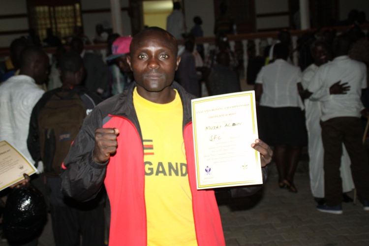 UPDF Lance Corporal Muzei Aldin with certificate  of participation awarded to him at  the Usalama Boxing Championship.