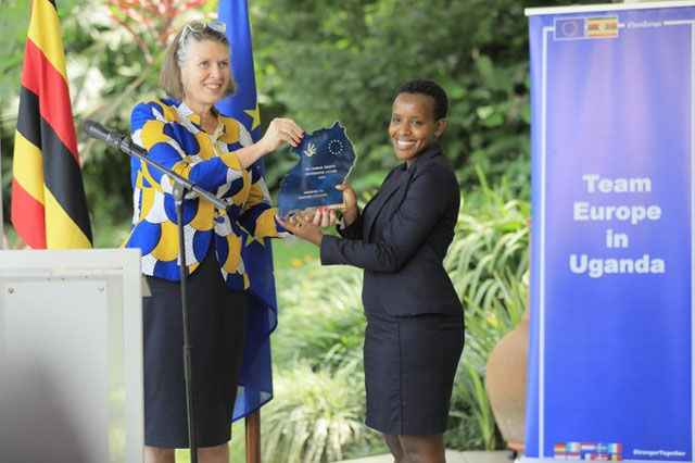 Netherlands Ambassador to Uganda Karin Boven hands award to Atuhaire