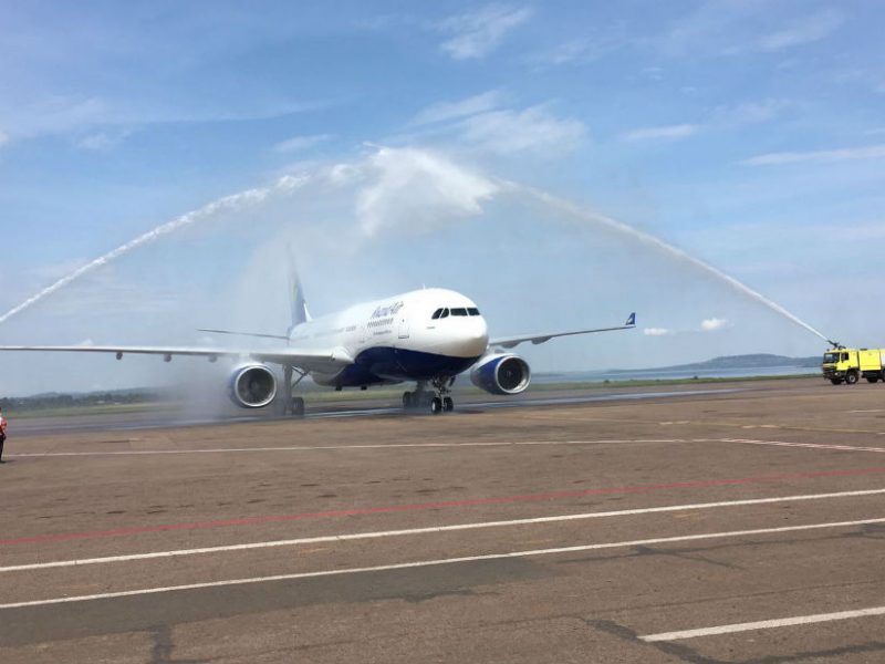 The airline’s chief executive John Mirenge, and a team of the airline officials and journalists were aboard the aircraft, as it touched the tarmac to a spectacular water salute.