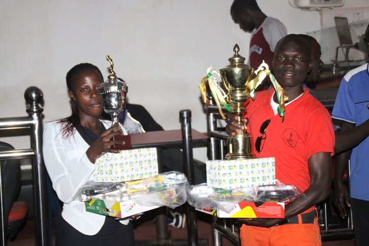Agnes Namutebi (L) and Brian Omirambe (R) pose for photos with their prizes.