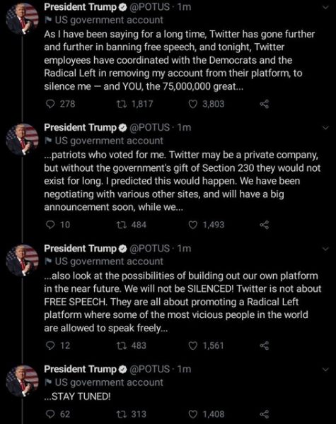 Trump has since criticised the big tech for banning “free speech,” saying, “We have been negotiating with various other sites, and will have a big announcement soon, while we also look at the possibilities of building out our own platform in the near future.” He emphasised: “Twitter is not about FREE SPEECH.”