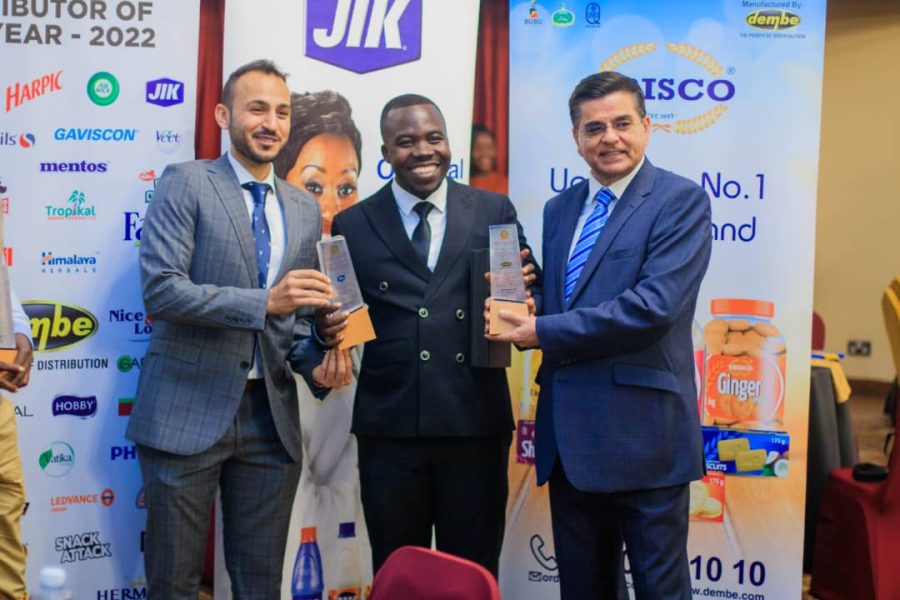 Dembe Group Managing Director, Adim Damani, Emmanuel Turyazooka Sales Manager Reckitt Uganda, and CEO of Dembe Group, Anil Damani pose with the award during the event.