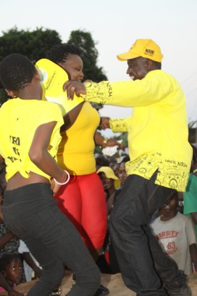 Singer Catherine Kusasira has never stopped smiling ever since Sevo recruited her to market the NRM party across the country. The bubbling singer is moving places and utilizing her musical talent on the NRM campaign trail to earn bread and butter. She has pocketed lots of dime from marketing NRM Party candidates including sevo who is battling it out with his former bush war doctor Rtd Col. Dr. Kizza Besigye and former NRM Party secretary General Amama Mbabazi. And last weekend the water-logged singer was hired to spice up Entebbe Municipality NRM Candidates. She paraded her huge wobbling butt at a rally in Banga- Nakiwogo and left several NRM fellas threatening to dump their Mama babies including a one Tom Byarugaba the Entebbe Airport NRM Group Boss. The horny fella almost drowned in the bummy singer’s boobs after he deeply run mad over her juicy butt and felt too much sensation in his pants.