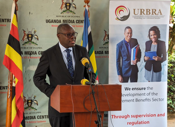 URBRA CEO Nsubuga talking to the press at a previous briefing. Finance Minister Kasaija has reinstated him after approval of the board.