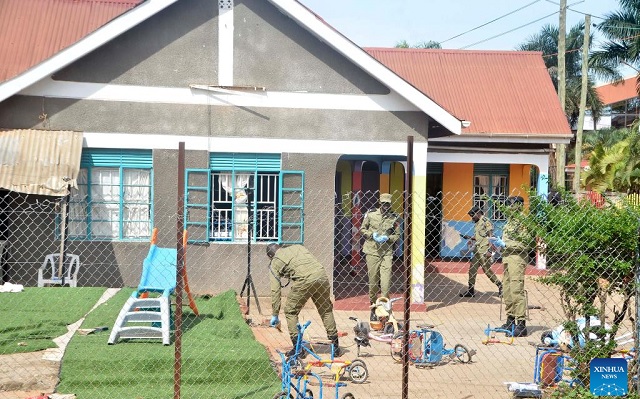 Ugandan police work at the scene where four children were killed in a stabbing incident at Ggaba Early Childhood Development Program School in Kampala, Uganda, on April 2, 2026. Ugandan police on Thursday provided further details on a fatal stabbing incident at Ggaba Early Childhood Development Program School in the capital, Kampala, where four toddlers were killed. (Photo by Nicholas Kajoba/Xinhua)