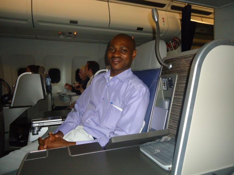 Kenneth Bainomugisha smiling in SN Brussels Aircraft.